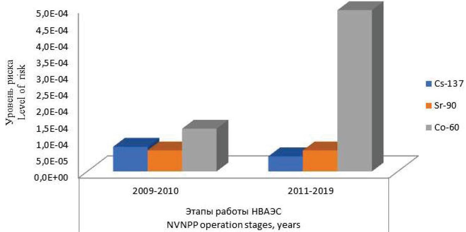 Уровень радиационного риска для ихтиофауны водоема-охладителя НВАЭС за десятилетний период наблюдения (2009–2019 гг.) повысился в 2,2 раза в основном за счет увеличения 60Co во многих компонентах водоема. За наблюдаемый период его влияние на формирование радиационных рисков возросло в 3,8 раза и составило 81,7 % от суммарного значения. Нельзя исключить, что увеличение 60Co в водоеме-охладителе НВАЭС связано с радиоактивным загрязнением подземных вод в результате аварии в 1985 г.
