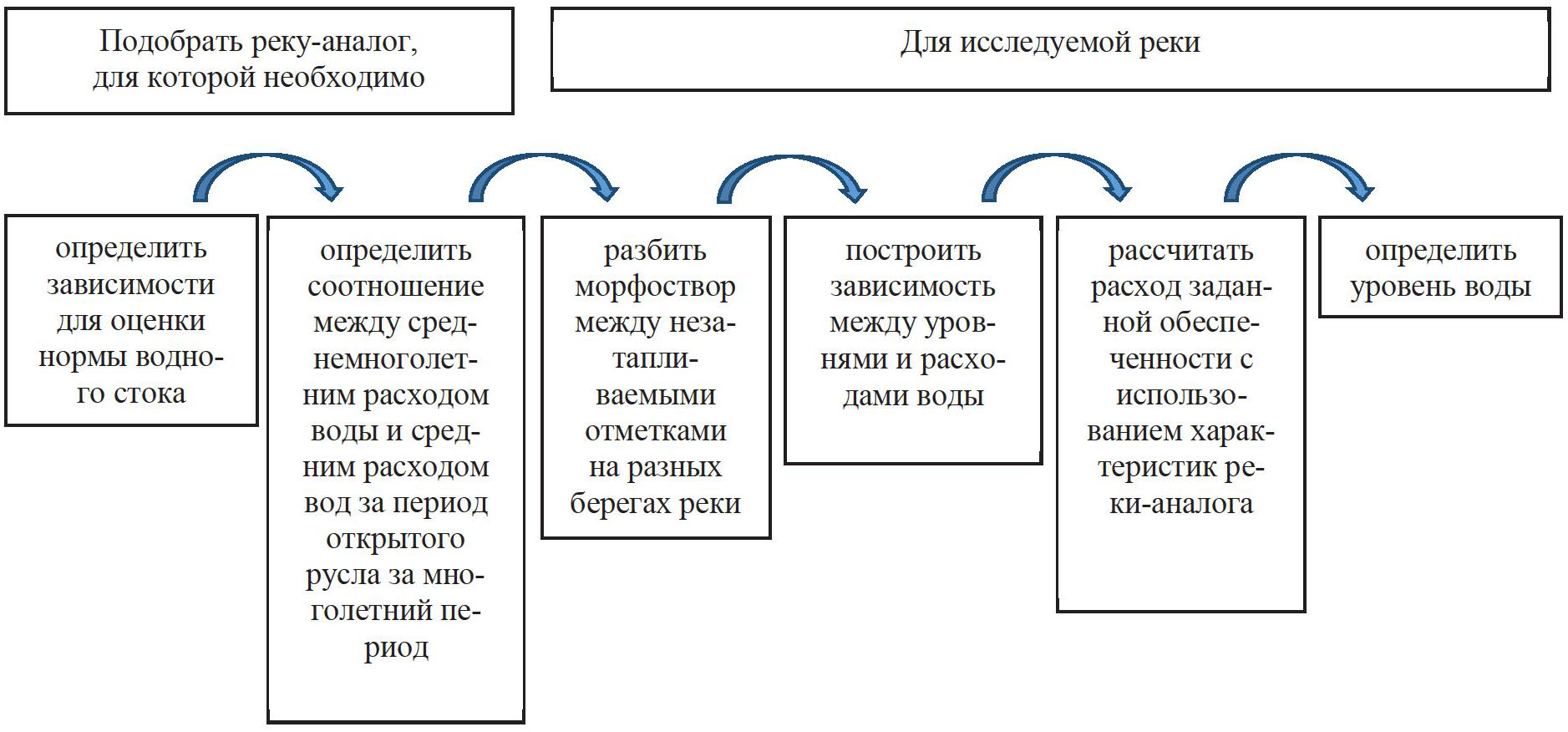 Необходимость оценки границ водных объектов и специальных зон их охраны и использования определяется требованиями Российского и международного законодательства [1–6], но имеет ряд теоретических и методических вопросов, затрудняющих решение этой задачи [7–10]. В частности, не всегда очевидно, как определить границу реки по среднему уровню воды за период открытого русла [1] при отсутствии данных режимных гидрометеорологических наблюдений. Если нет подобных данных, то [11, 12] необходимо руководствоваться алгоритмом, представленным на рис. 1, подобрав реку-аналог.