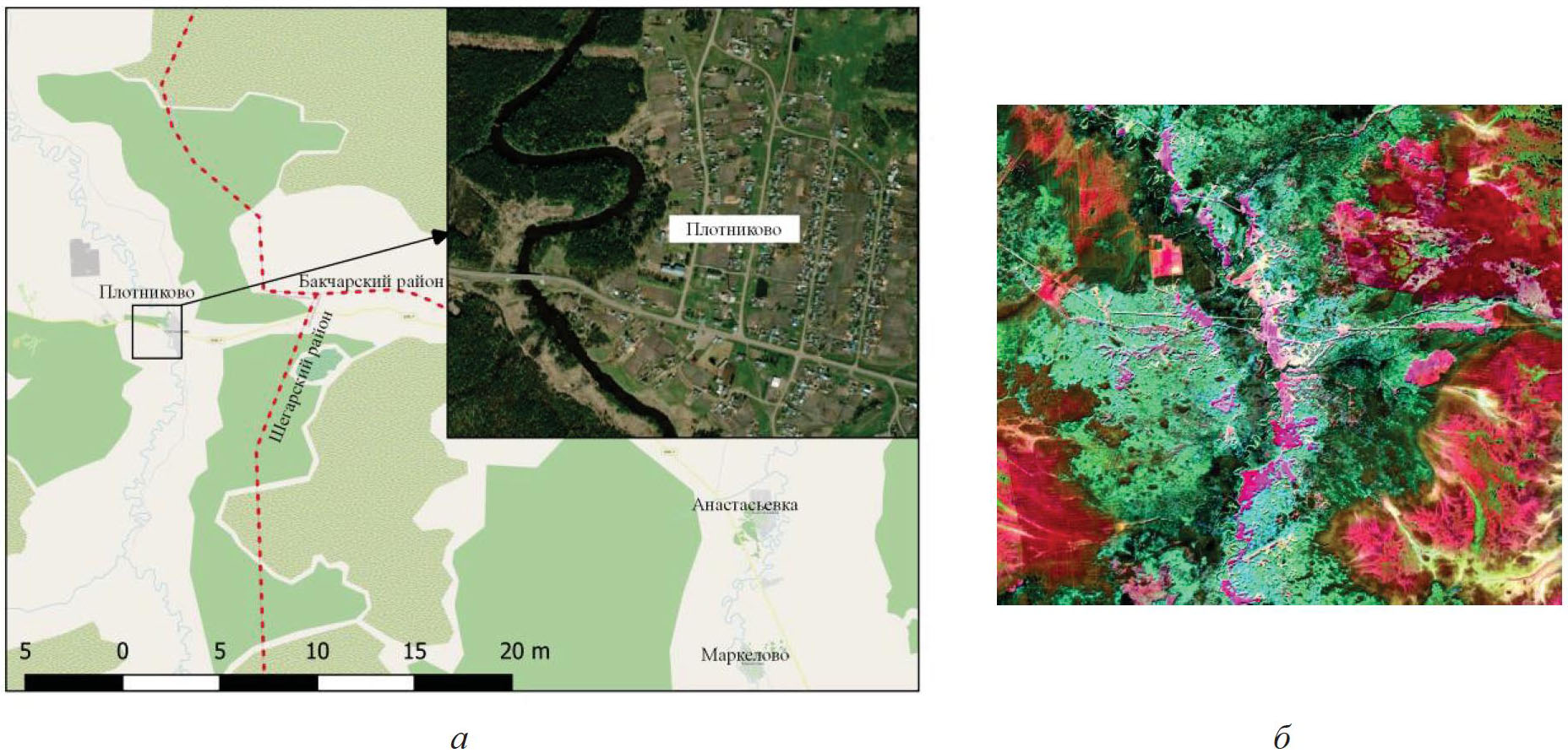 Рис. 2. Схема расположения (a) и снимок LandSat 7 (б) исследуемого участка на р. Иксе у с. Плотниково