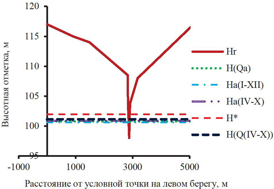 Fig. 3. River Iksa valley profile near the village Plotnikovo and average water levels calculated in various ways (Table 1); Hr – elevation of the surface of the catchment area and the river bottom; other designations are in the Table 1