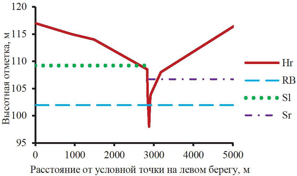 Рис. 4. Профиль долины р. Иксы у с. Плотниково и уровни воды, соответствующие: RB – береговой линии при отметке 104,94 м БС; Sl и Sr – лево- и правобережной границам водоохранной зоны; Hr – высотная отметка поверхности водосбора и дна реки