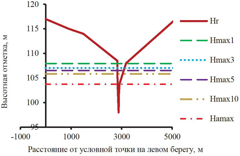 Рис. 5. Профиль долины р. Иксы у с. Плотниково и максимальные уровни воды обеспеченностью 1 % (Hmax1), 3 % (Hmax3), 5 % (Hmax5), 10 % (Hmax10); Hamax – средний максимальный уровень воды; Hr – высотная отметка поверхности водосбора и дна реки