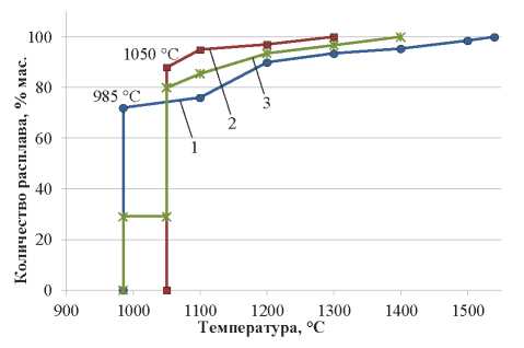 Fig. 1. Equilibrium melting curves of perlite when recalculating compositions for three-component systems: 1 – K2O-Al2O3-SiO2; 2 – Na2O-Al2O3-SiO2; 3 – expectable melting curve as applied to potassium and sodium oxides content