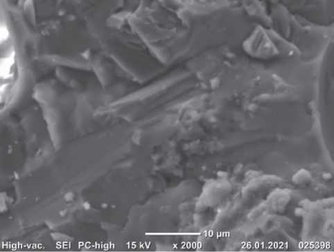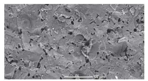 Анализ зависимостей рис. 2 показывает, что максимальная прочность и усадка, минимальное водопоглощение имеют образцы керамики после обжига при 1100 °С. После обжига керамики при температурах 1150–1200 °С прочность и усадка уменьшаются, а водопоглощение растет, что связано с увеличением объёма и размеров закрытых пор за счет повышения давления в порах при росте температуры выше 1100 °С. Поры видны на микрофотографии керамики после обжига при 1150 °С (рис. 3).