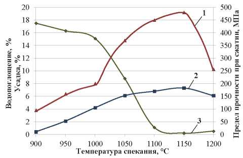 Для жидкостного спекания керамики необходимо образование при обжиге 30±5 мас. % расплава. В соответствии с вероятной кривой плавкости (рис. 1, кривая 3) при 1100 °С может образоваться 25,5 % расплава, а при 1150 °С – около 27 %, что достаточно для спекания керамического материала. Это дает основание предположить, что спекание композиции будет завершаться в интервале температур 1100–1150 °С. На рис. 2 представлены зависимости водопоглощения, усадки и прочности керамических образцов от температуры обжига в интервале 900–1200 °С.