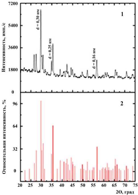 Рис. 7. Рентгенограмма керамики с диопсидовой кристаллической фазой (1), эталонная штрих-диаграмма рентгеновской дифракции диопсида – Ca·Mg·S2O6 (2)