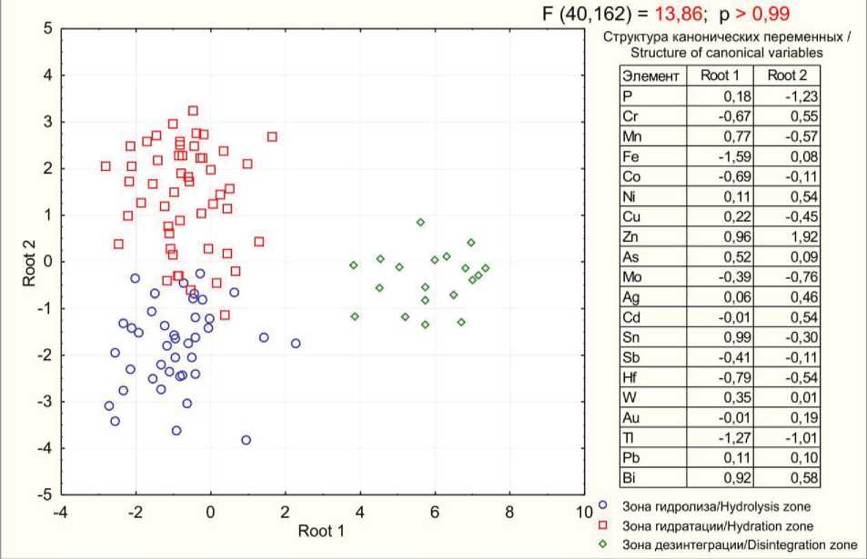 Отдельно для золотоносной и незолотоносной части остаточной коры выветривания проведен дискриминантный анализ для подтверждения различия между выделенными в разрезе зонами коры выветривания. Дискриминантный анализ показывает, что выделенные зоны незолотоносной коры выветривания уверенно различаются по своим геохимическим особенностям (рис. 1). Статистическая значимость различий превышает 99 %.