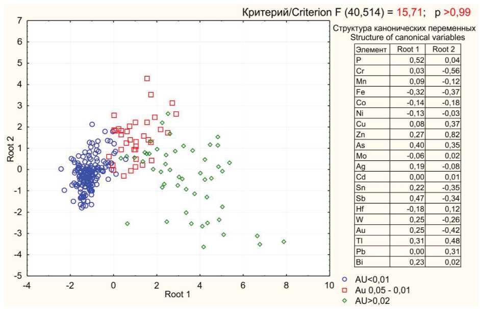 Рис. 2. Результат дискриминантного анализа эталонных выборок с разной золотоносностью коры выветривания
