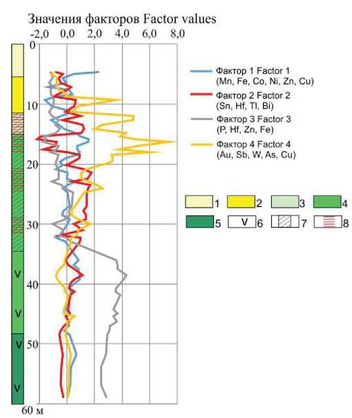 Результатом факторного анализа является матрица факторных нагрузок, которая содержит коэффициенты, представляющие взаимосвязи между факторами и переменными. Коэффициент с высоким абсолютным значением показывает, что фактор и переменная тесно взаимосвязаны. Для упрощения интерпретации факторов проведено вращение факторных осей методом варимакс [15, 17]. Критериев статистической значимости коэффициентов матрицы факторных нагрузок не существует, для удобства восприятия жирным шрифтом выделены их значения от 0,4 и выше, объединяющие, по опыту работ, наиболее информативные для данной ассоциации химические элементы (табл. 4).