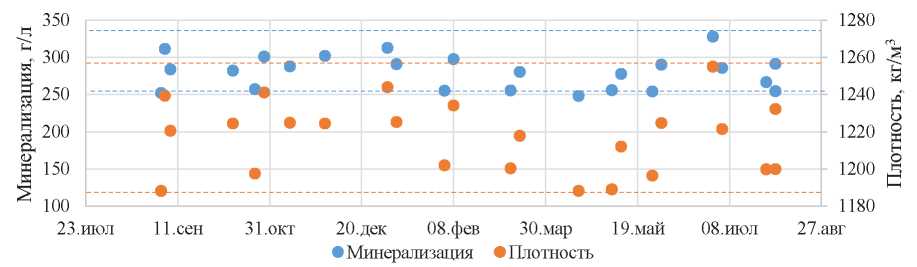 В результате анализа проб воды, направляемых в систему поддержания пластового давления, построена диаграмма, приведенная на рис. 1. Срок рассмотрения – один календарный год. На диаграмме приводятся лишь значения расчетной плотности и измеренной минерализации.