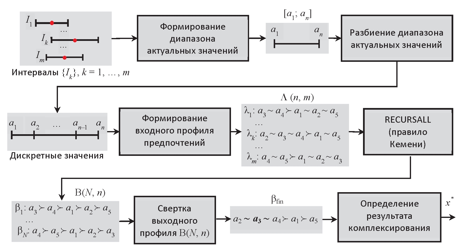 Профиль Β(N, n) преобразуется в единственное итоговое ранжирование консенсуса βfin по правилу свёртки, описанному в [15, 20]. В качестве результата комплексирования x* принимается наиболее предпочтительное дискретное значение в итоговом ранжировании консенсуса βfin.