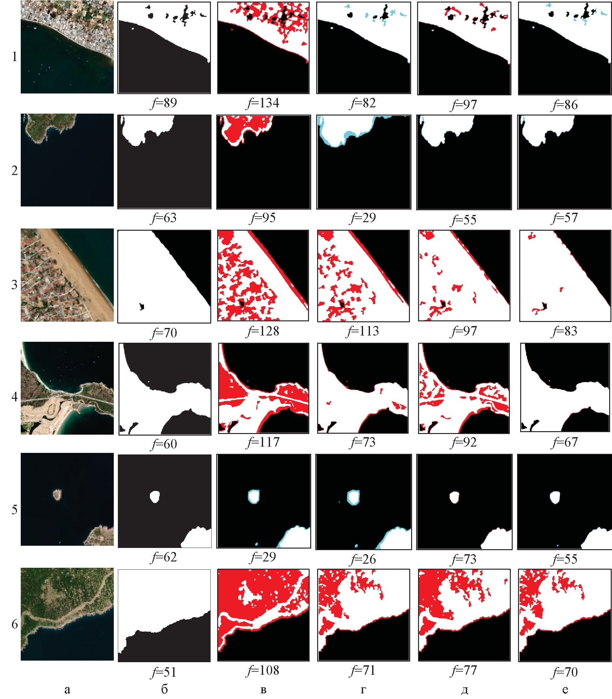 На рис. 7 представлены примеры сегментации изображений с помощью пороговой обработки, где f вычисленный соответствующим методом порог для каждого изображения. На рис. 7 красным цветом показаны чрезмерно сегментированные области суши, а голубым цветом недостаточно сегментированные области моря. Это явление нередко возникает при применении пороговых методов [27], особенно при недостаточной однородности сегментируемых областей. Для преодоления этого недостатка обычно применяют более совершенные подходы к сегментации, такие как наращивание областей, детектирование контуров и т. д. [8, 23].