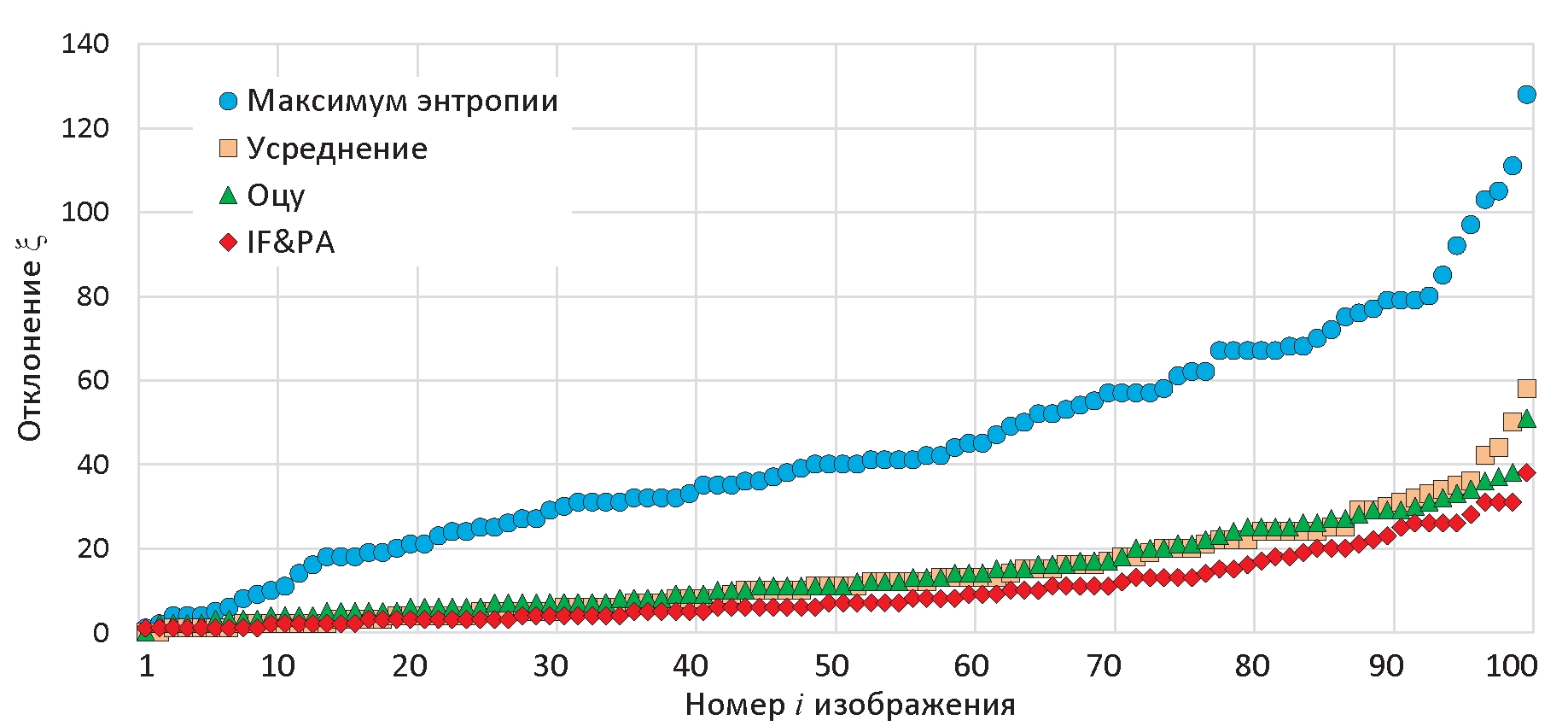 Были построены кривые распределения рассчитанных по формуле (13) отклонений ξi (рис. 8) порогов, определенных методами максимума энтропии, усреднения, Оцу и IF&PA, по всем 100 проанализированным изображениям. На графиках группы значений ξi, относящиеся к одному тестируемому методу, упорядочены по возрастанию с целью повышения информативности визуализации.