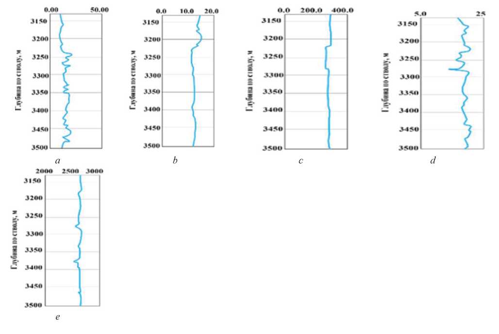 Рис. 6. Скважина В. Информация о прихвате трубы: a–e) характер изменений по глубине ствола скважины следующих параметров: скорости проходки, м/ч (a); нагрузки на долото, кг (b); числа оборотов, c–1 (c); крутящего момента, кН‧м (d); давления в стояке, атм (e)