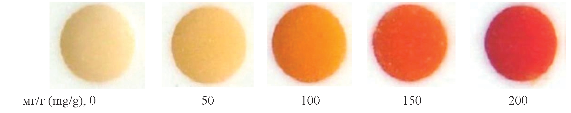 Рис. 2. Изменение цвета сорбента в зависимости от количества сорбированных катионов Me(II)