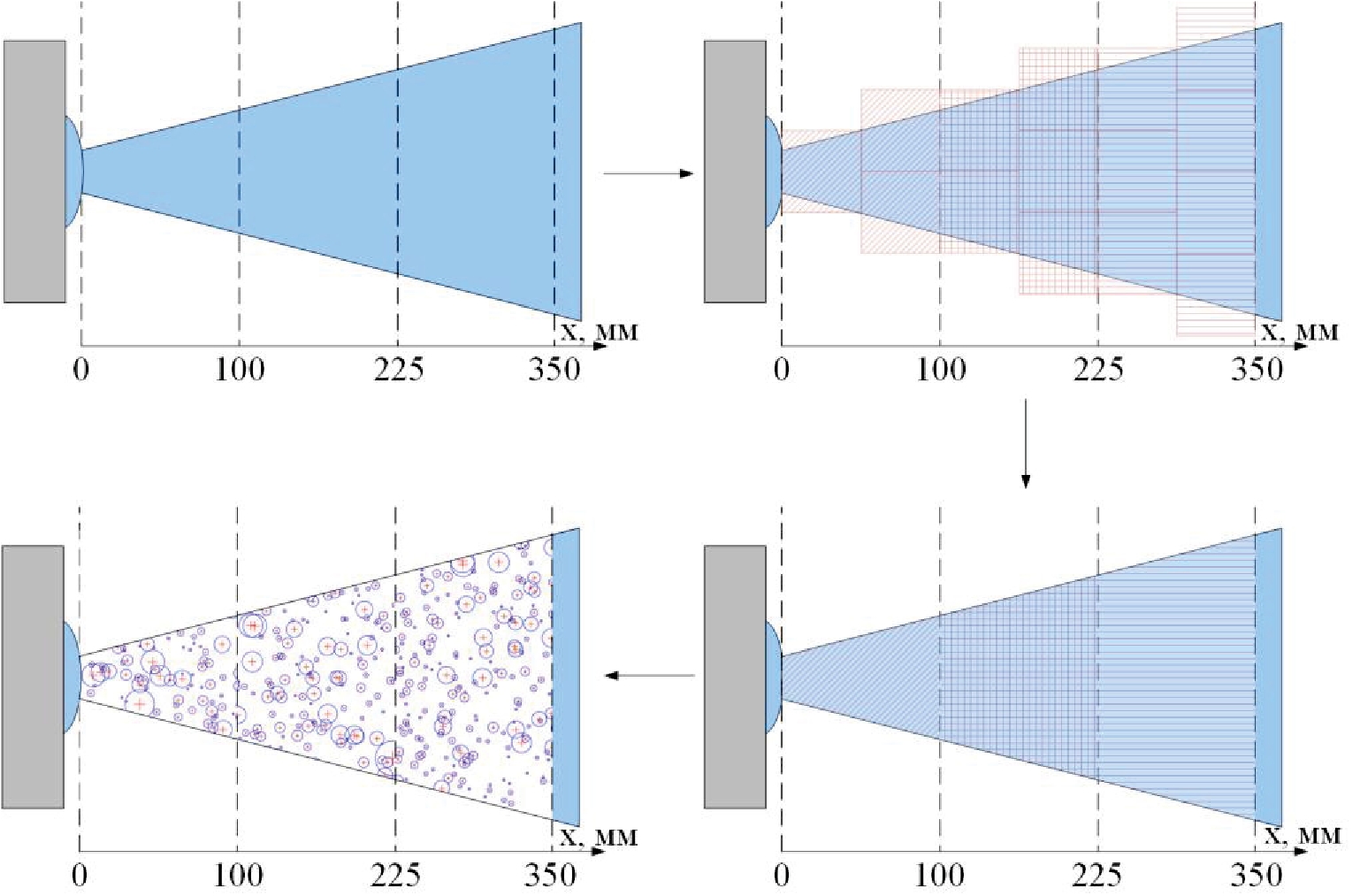 Высокоскоростная регистрация струи осуществлялась в ее областях на расстояниях 0–100, 101–225 и 226–350 мм (рис. 3, а) от сопла форсунки по продольной оси Z. Учитывая, что размер области регистрации кросскорреляционной камеры составляет 35×35 мм (S), а струя в сечении имеет форму треугольника, для получения более полной информации о среднем размере капель ВУС ее сечение разделялось на множество областей S, в которых осуществлялась их регистрация кросскорреляционной камерой (рис. 3, б). В процессе обработки полученных результатов при помощи программного обеспечения ActualFlow учитывались только зафиксированные в струе капли (рис. 3, в).