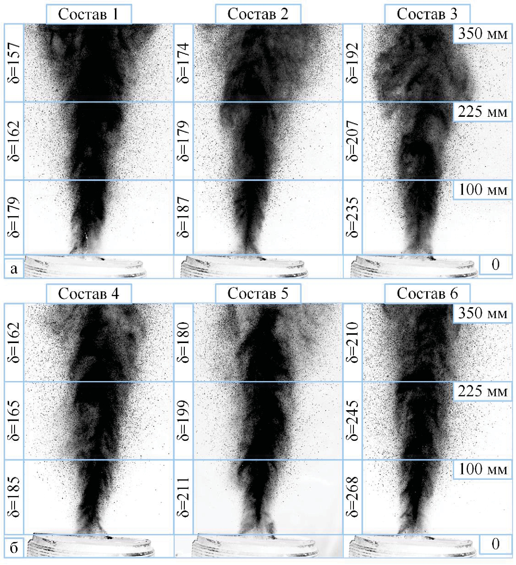 Процесс распыления всех составов ВУС (табл. 1) осуществлялся при давлении ВУС 0,05 МПа и давлении воздуха 0,3 МПа.
