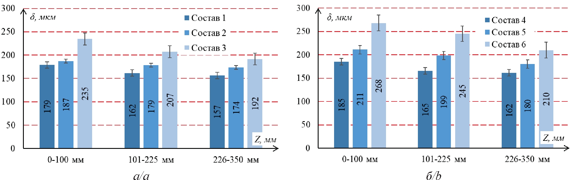 На рис. 7 в виде гистограмм показано изменение среднего размера капель в трех областях исследования для всех составов ВУС (табл. 1).