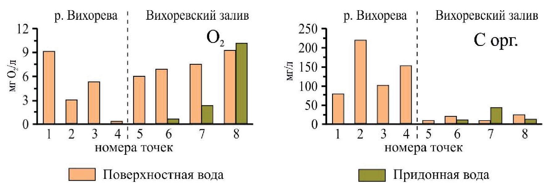 Рис. 2. Концентрация кислорода и органического углерода в воде р. Вихорева и Вихоревского залива. Примечание: Номера точек соответствует точкам наблюдений, указанных на рис. 1