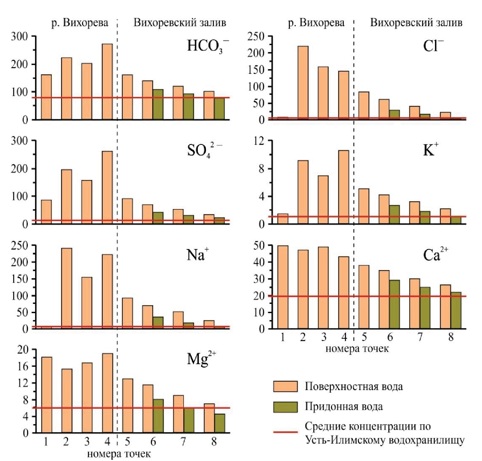Рис. 3. Концентрации главных ионов (мг/л) в воде р. Вихорева и Вихоревском заливе (точки наблюдений соответствуют точкам наблюдений на рис. 1). Средние концентрации в воде русловой части Усть-Илимского водохранилища приведены по [16]