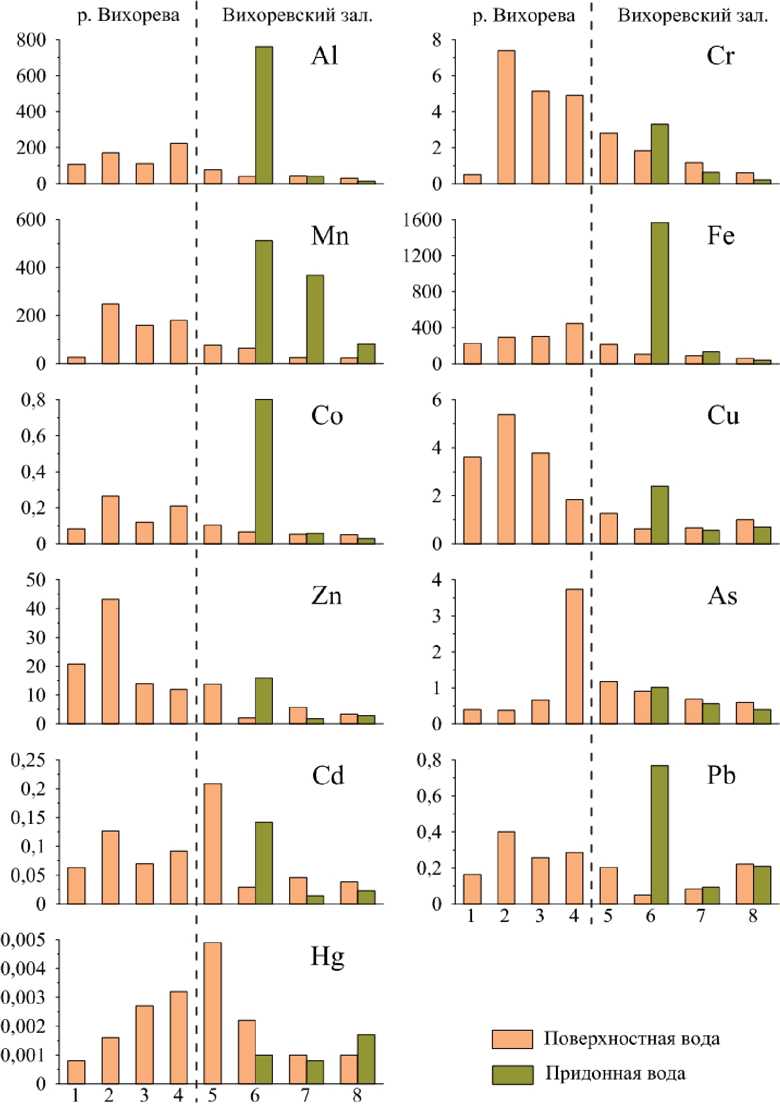 Результаты пространственного распределения микроэлементов по течению р. Вихорева показывают, что после поступления сточных вод последовательное снижение концентраций в водной среде характерно только для Cr, Zn, Cu. Концентрации Hg и As, напротив, увеличиваются. Распределение Al, Mn, Fe, Cd, Pb в воде реки неравномерно. Смешение вод р. Вихорева и Вихоревского залива (т.н. 5) приводит к уменьшению высоких концентраций Al, Cr, Mn, Fe, Cu, As, Pb в водной среде. Основным фактором самоочищения на этом участке является многократное разбавление загрязненных вод реки водами Вихоревского залива, формирующимися под влиянием вод русловой части Усть-Илимского водохранилища. В отличие от главных ионов, характерной особенностью для большинства изучаемых микроэлементов является приуроченность их максимальных концентраций не к основному источнику техногенного загрязнения – стокам Братской промышленной зоны, а к акватории Вихоревского залива (рис. 4). В водах загрязненной реки определены только максимальные концентрации Cu, As, Cr и Zn. Самые высокие концентрации Al, Mn, Fe, Pb и Со зафиксированы в т.н. 6, Cd и Hg – в т.н. 5 Вихоревского залива.