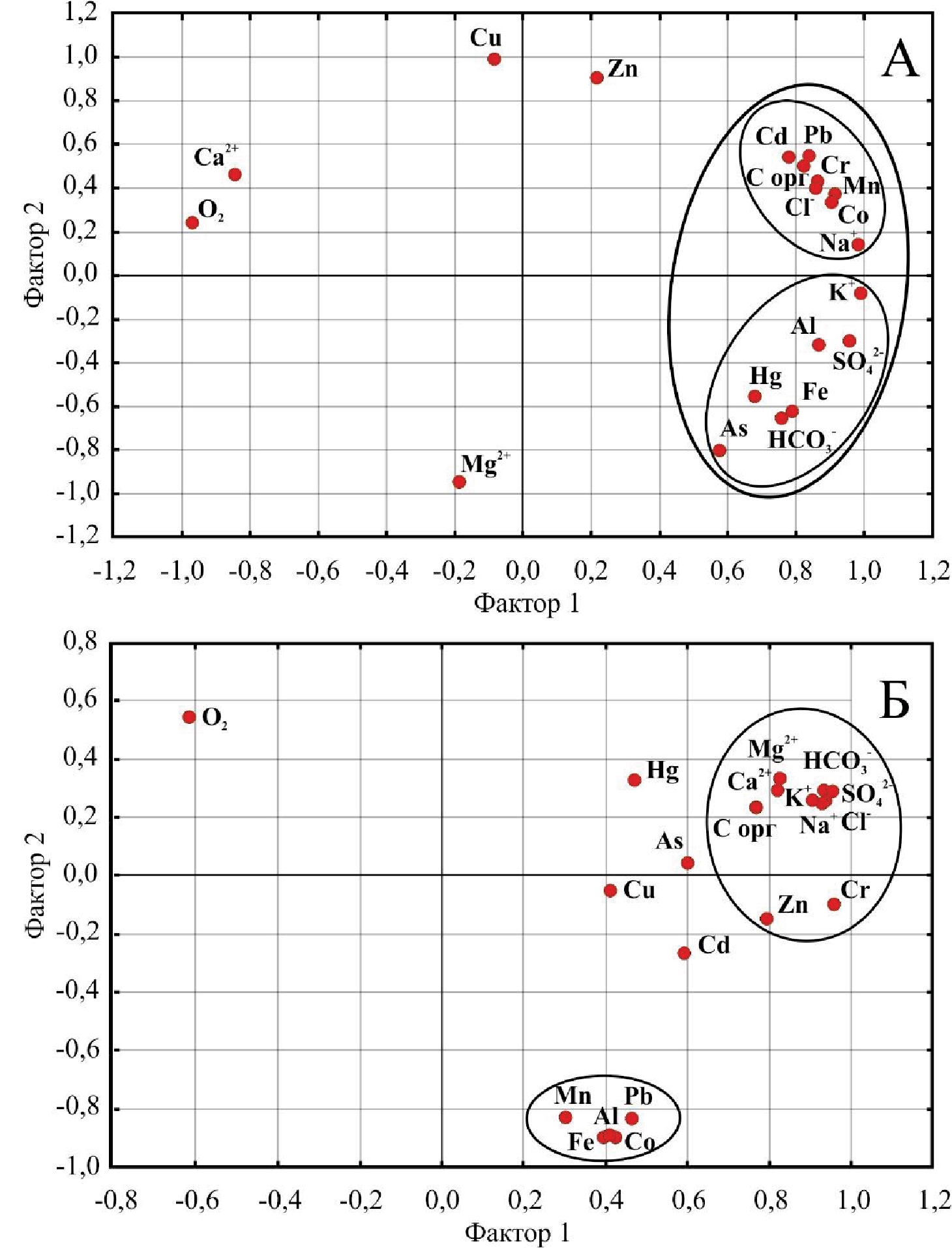 Рис. 5. Факторный анализ концентраций главных ионов, микроэлементов, растворенного кислорода и Сорг в водах р. Вихорева (А) и Усть-Вихоревского залива (Б)