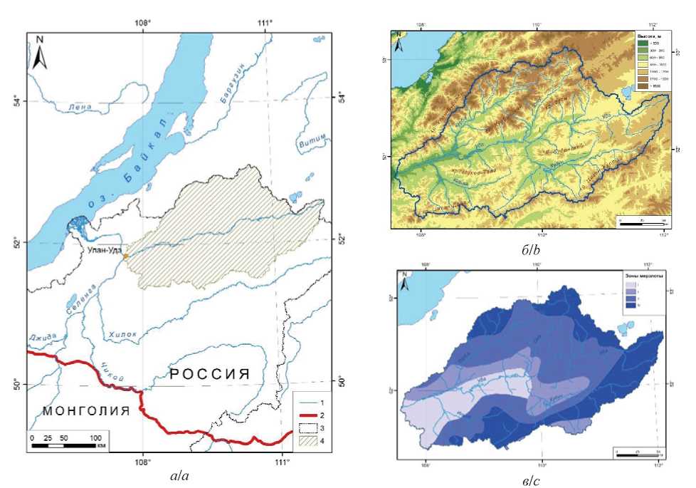 Fig. 1. Study area: a) overview diagram: 1 – river network, 2 – state border of the Russian Federation, 3 – boundary of the Selenga River basin, 4 – Uda River basin; b) orographic scheme; c) types of permafrost distribution according to [6]: I – thawed rocks, II – sparsely insular, III – massively insular, IV – continuous