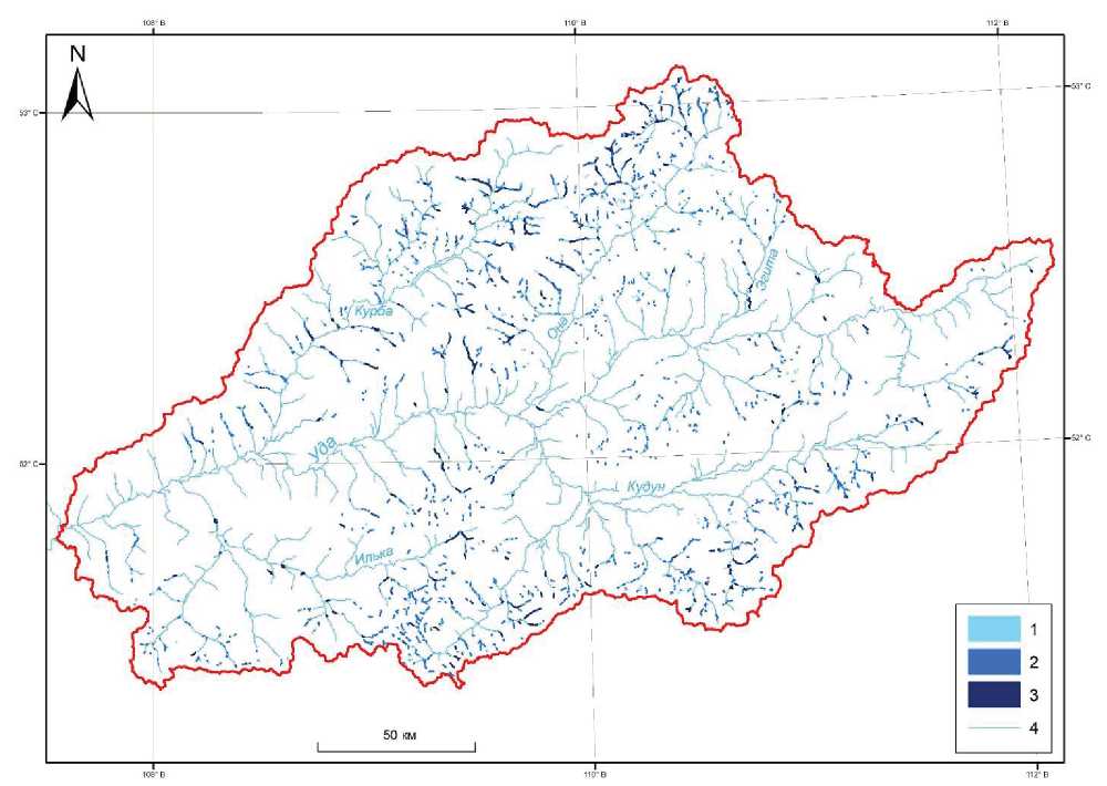 Fig. 2. Distribution of icings in the Uda river basin in spring of 2023: 1 – medium, 2 – large, 3 – very large, 4 – river network