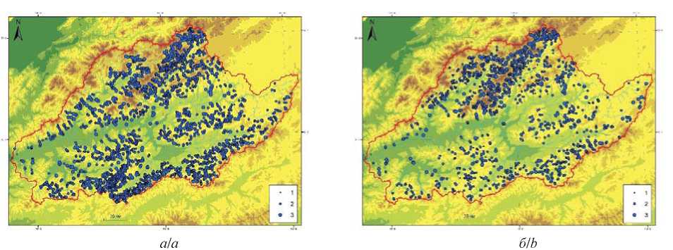 Рис. 3. Динамика наледей: а) 2000 г.: б) 2017 г. Наледи: 1 – средние, 2 – большие, 3 – очень большие