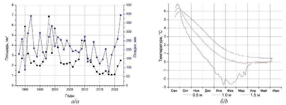 Рис. 4. Динамика площадей наледей (на ключевом участке) в сравнении с количеством осадков предшествующего теплого периода года (а) и динамика температуры в слое сезонного промерзания на ключевом участке исследования (б) в период развития наледей в 2022–2023 гг.