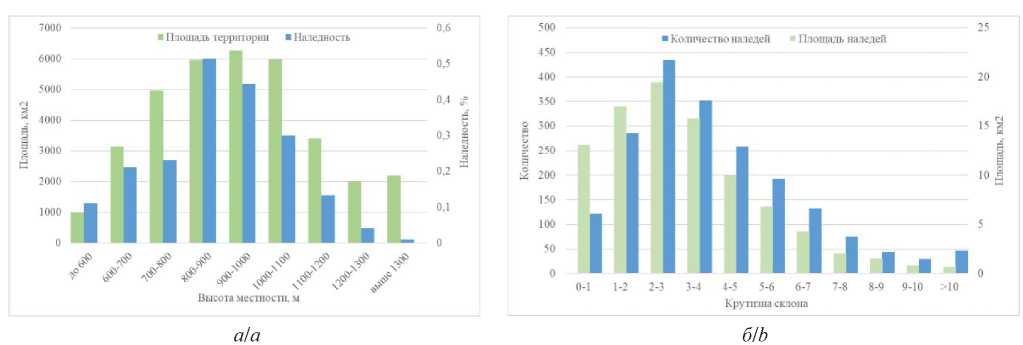 Рис. 5. Распределение наледей в рельефе в зависимости от: а) абсолютной высоты; б) крутизны склонов