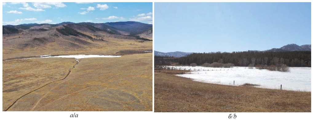 Рис. 7. Использование наледи как источника водоснабжения в сельском хозяйстве: а) оросительный канал для забора воды при таянии наледи у подножья хр. Улан-Бургасы; б) искусственно накопленная наледь на сенокосе в долине р. Воровки
