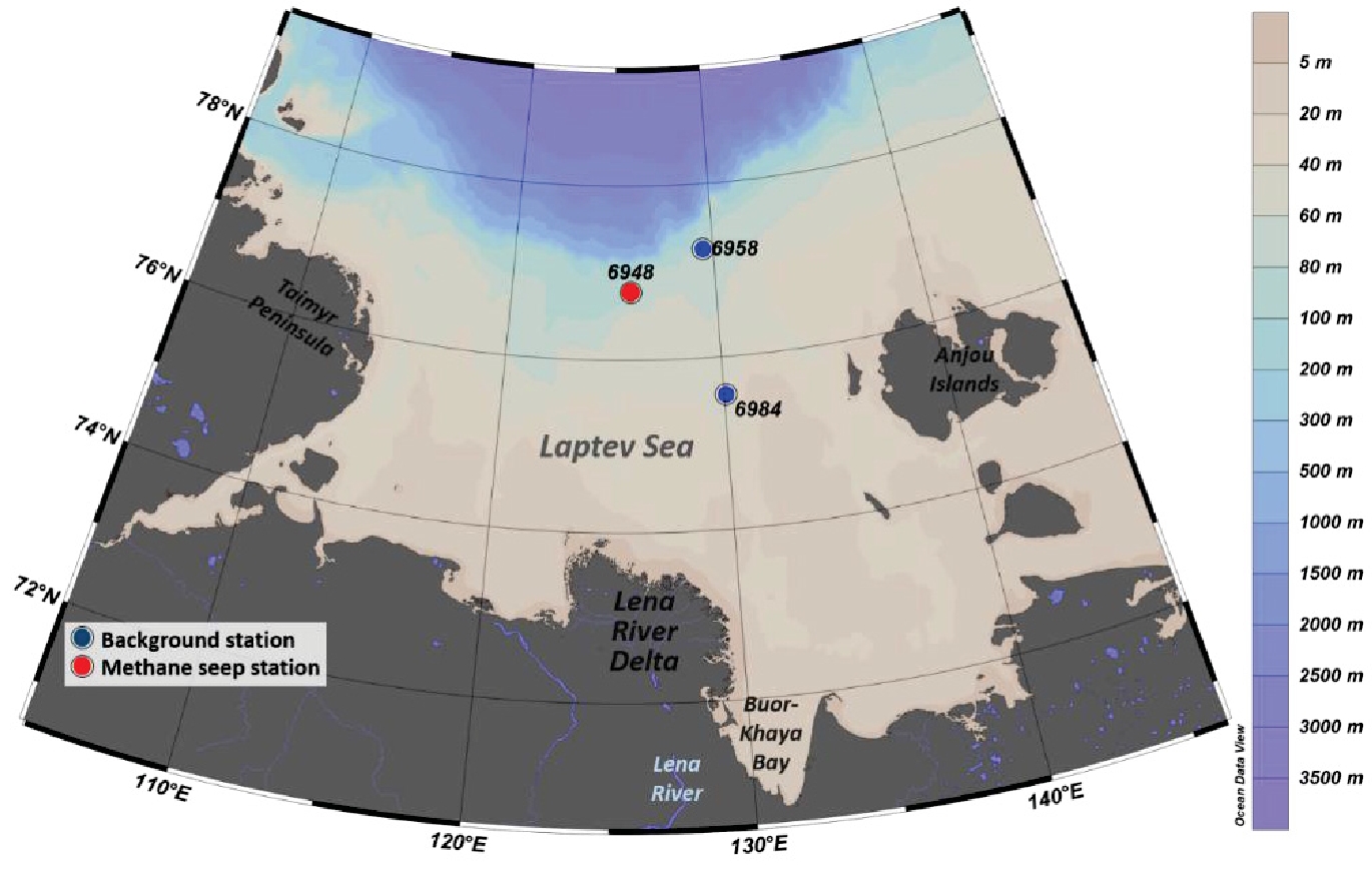Район исследования покрывает зону внешнего шельфа до границы с континентальным склоном в северо-восточной части моря Лаптевых. Оно является окраинным материковым морем Северного ледовитого океана, заключенным между полуостровом Таймыр и архипелагом Северная Земля с запада и Новосибирскими островами на востоке. Море Лаптевых является самым мелководным и ледовитым морем Арктического бассейна. Оно преимущество расположено в зоне шельфа, поэтому 53 % всей площади занимают глубины до 50 м. До горизонтали 76о с.ш. доминируют глубины, не превышающие 25 м. По направлению к северу наблюдается резкий переход от шельфовой зоны к материковому склону и далее к ложе океана с глубинами более 2000 м (22 % площади моря). Для данной акватории характерны олиготрофные условия с низкой первичной продуктивностью, где основным источником ОВ служит эродирующий береговой ледовый комплекс и речной сток р. Лены (510 км3/год) [25].