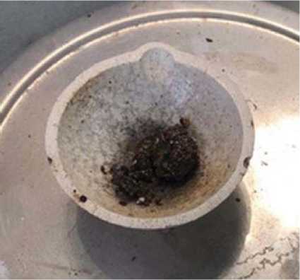 В соответствии с разработанной методикой были проведены экспериментальные исследования по обработке подстилочного куриного помета в СВЧ-плазме. После обработки СВЧ-плазмой в тигле образовался биоуголь, который необходимо было набрать до массы в 2 г для последующего лабораторного химического анализа на наличие фосфора. Для этого были проведены серии опытов. Всего было выполнено 40 опытов обработки высушенного помета в СВЧ-плазме в течение 3, 4, 5, 6 и 7 минут. Фиксировалась масса отхода и масса биоугля. Температура в тигельной камере составляла 1560 °С. Биоуголь имел неравномерный кирпичный цвет к центру переходящий в графитово-черный, что свидетельствует о том, что в остатке присутствует углерод и его соединения. Биоуголь собирался в контейнеры для последующего лабораторного химического анализа на наличие фосфора. При увеличении времени обработки до 7 мин наблюдалось стеклоподобное вещество, предположительно, образовавшееся в результате спекания и перехода в аморфное состояние минеральных соединений, присутствующих в помете с подстилкой: алюмосиликатов, оксидов кремния, кальцитов и т. д. (рис. 1).