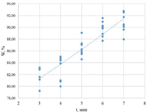 Рис. 2. Зависимость потери массы отхода (W) от времени плазменной обработки куриного помета (t, мин)