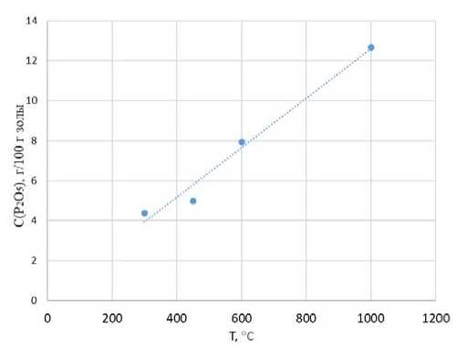 Fig. 6. Dependence of Р2О5 content, g/100 g of biochar, on the temperature of induction pyrolysis of chicken manure (Т, °С)