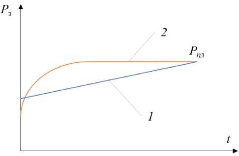 Рис. 1. График изменения забойного давления при регистрации КВД/КВУ в скважине с околоскважинной зоной где: (1) проницаемость не ухудшена; (2) проницаемость ухудшена