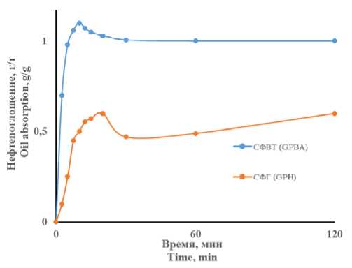 V. Качественно кривые нефтепоглощения обоих сорбентов близки, однако сорбент № 1 СФВТ имеет лучшие характеристики. Как показано на рис. 3, локальный максимум нефтепоглощения наблюдается на 12,5 минуте экспозиции сорбента № 1 СФВТ. При этом поглощается 1,07 г/г. У сорбента № 2 СФГ максимальное насыщение происходит на 20 минуте при наблюдаемом поглощении 0,6 г/г. После достижения локальных максимумов (происходит первичное насыщение сорбента) следует переход в стационарный режим, сопровождаемый небольшим снижением нефтепоглощения, причины которого рассмотрены в работе. Наблюдаемый характер кривых обусловлен стеклообразным состоянием поверхности. Можно предположить, что капиллярная пропитка сопровождается частичной десорбцией воздуха из пор, что обуславливает некоторое снижение нефтепоглощения. Далее система переходит в равновесное состояние. Таким образом, нефтепоглощение образцом № 1 СФВТ происходит намного быстрее, чем образцом № 2 СФГ.