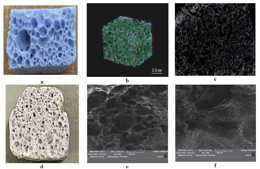 Рис. 4. a) общий вид сорбента № 1 СФВТ; b) снимок компьютерной микротомографии 3D; с) снимок компьютерной микротомографии; d) общий вид сорбента № 2 СФГ; e) снимок сканирующей электронной микроскопии; f) снимок сканирующей электронной микроскопии (кристаллизация) [составлено авторами]