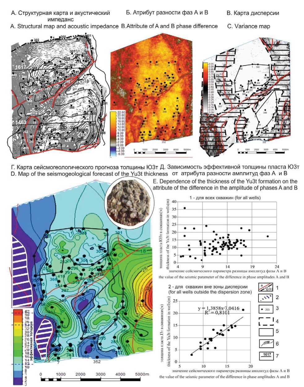 Выполненное сопоставление рассчитанного атрибута разности амплитуды фазы А и В со значениями эффективных толщин пласта Ю3т по скважинам выделенных полигонов показало хорошую корреляционную зависимость (рис. 1, Д-2).
