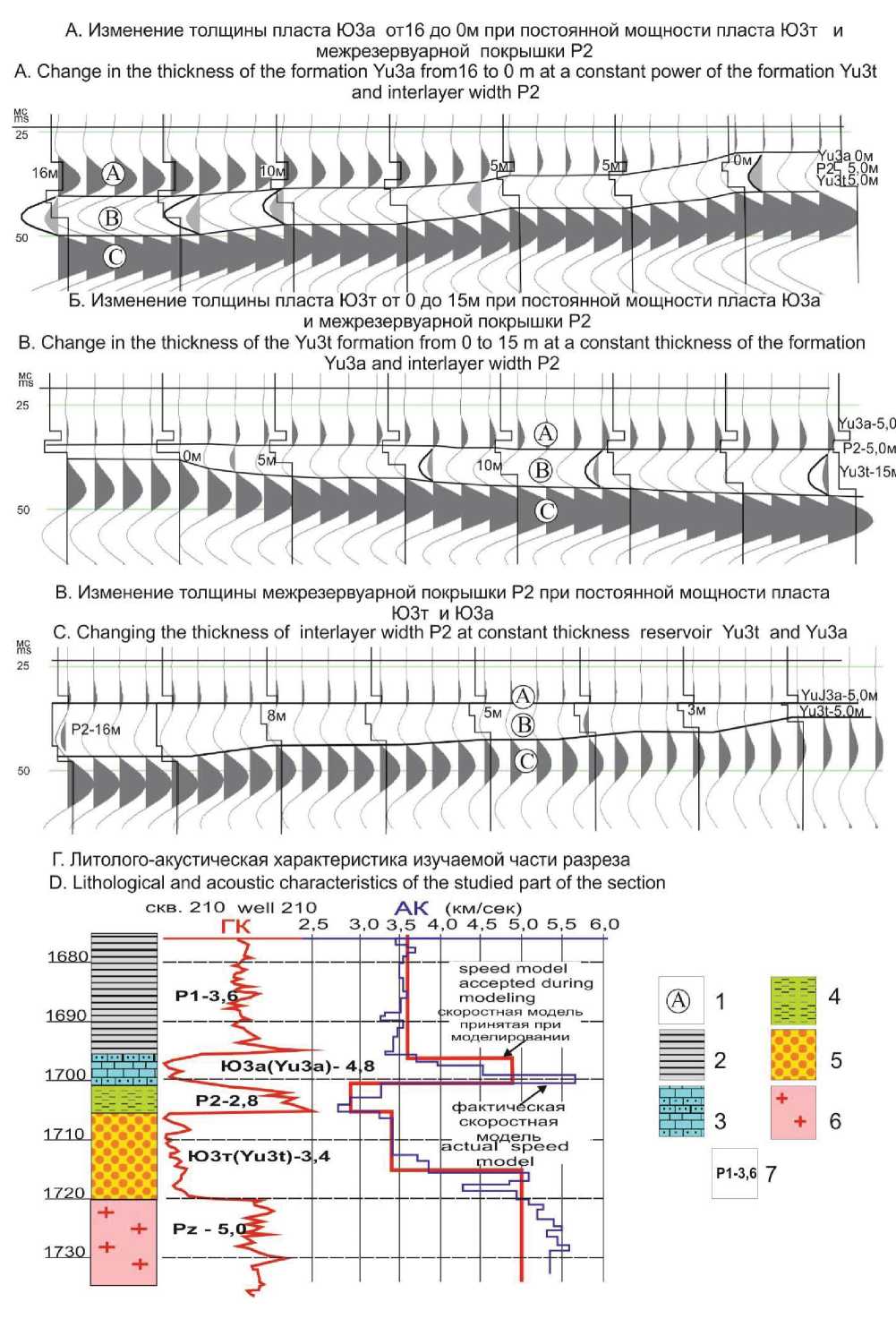 Связано это с тем, что с возрастанием толщины пласта Ю3т увеличивается как амплитуда фазы В, так и межфазовый временной интервал А–С (рис. 2, В). В то же время расширение межфазового временного интервала А–С отмечается и в случае изменения толщин покрышки Р2 (рис. 2, В), что приводит к неоднозначности прогноза толщины пласта Ю3т по анализу временного интервала фаз А–С.