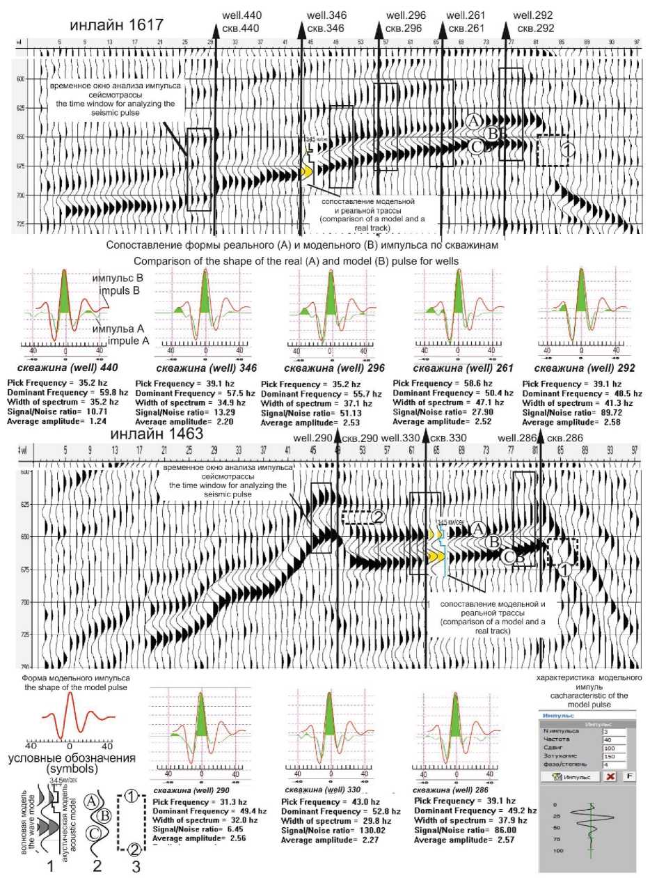 В соответствии с частотной характеристикой реального импульса формировался модельный импульс, параметры которого представлены на рис. 3. На основе полученного импульса и осреднённой акустической модели рассматриваемого интервала разреза в скважинах проводилось одномерное моделирование.