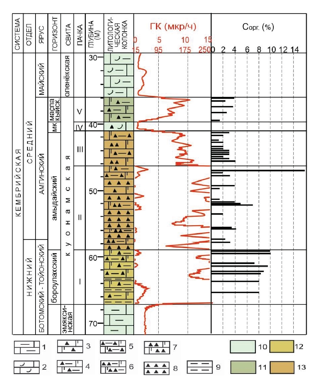 Fig. 2. Structure and composition of the Kuonamka formation (on the example of one of the wells). 1, 2 – limestones: 1 – argillaceous, 2 – with faunal detritus; 3–5 – mixed rocks: 3 – siliceous-carbonate, 4 – argillaceous-siliceous-carbonate, 5 – carbonate-clay-siliceous; 6–8 – silicites: 6 – clay-carbonate, 7 – carbonate, 8 – with carbonate material <5%; 9 – mudstones; 10–13 – prevailing composition of rocks in different members: 10 – calcareous, 11 – siliceous- calcareous, 12 – siliceous-argillaceous, 13 – siliceous