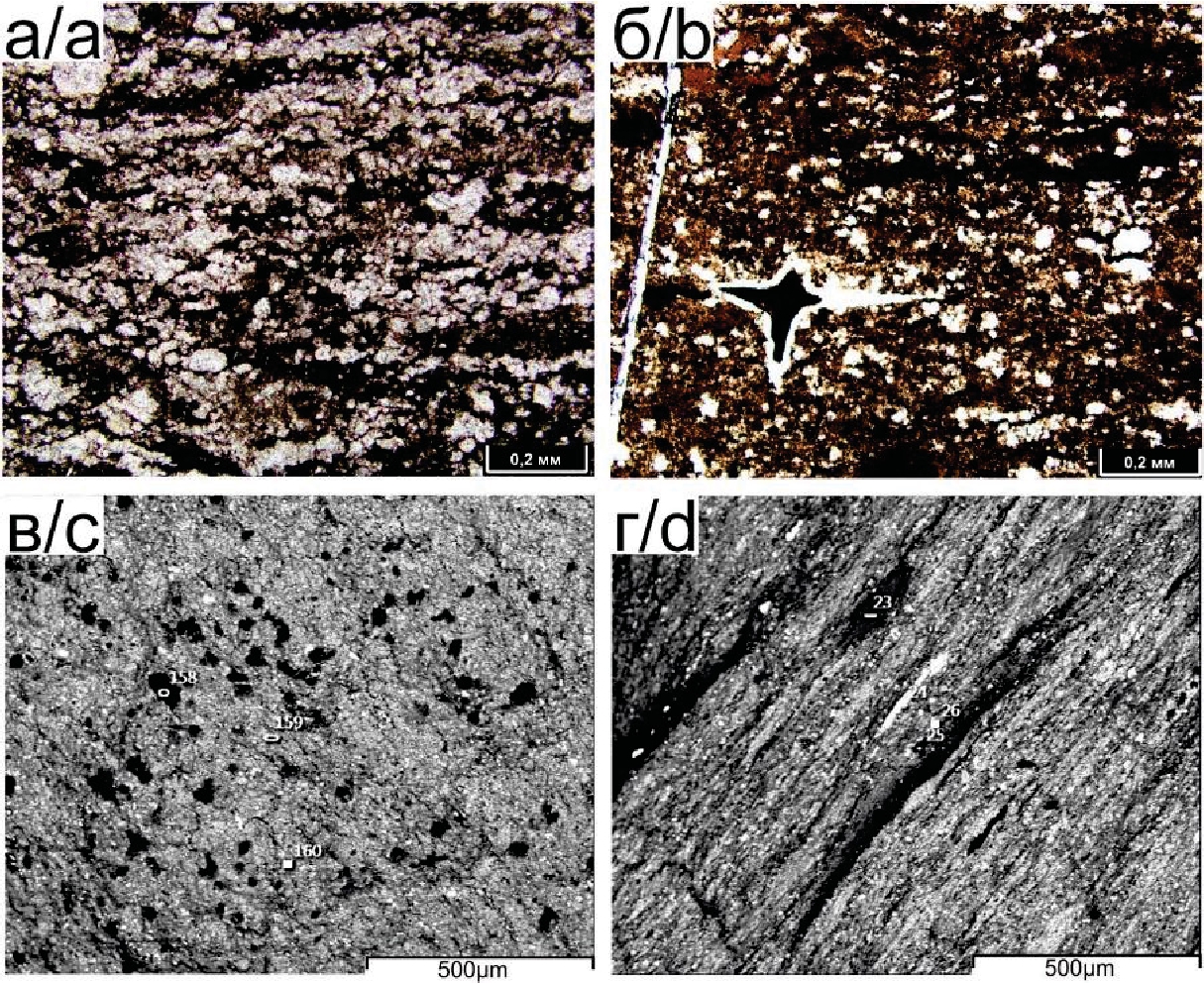 Кроме основных компонентов, иногда в качестве породообразующего выступает ОВ, морфология и форма нахождения которого различны. Исследование ОВ в прозрачных шлифах под поляризационным микроскопом и методом сканирующей электронной микроскопии показало, что оно присутствует в двух формах: 1) в виде тонкоперетертого детрита (размер частиц меньше 0,05 мм), неравномерно рассеянного и/или образующего послойные скопления (рис. 4, в); 2) в виде аморфного вещества, окрашенного в проходящем свете в разные оттенки красного, желтого и бурого цвета, выполняющего послойно ориентированные сильно уплощенные линзочки (шириной 0,01–0,15 мм, длиной от 0,05 до 1–2 мм) (рис. 4, г).