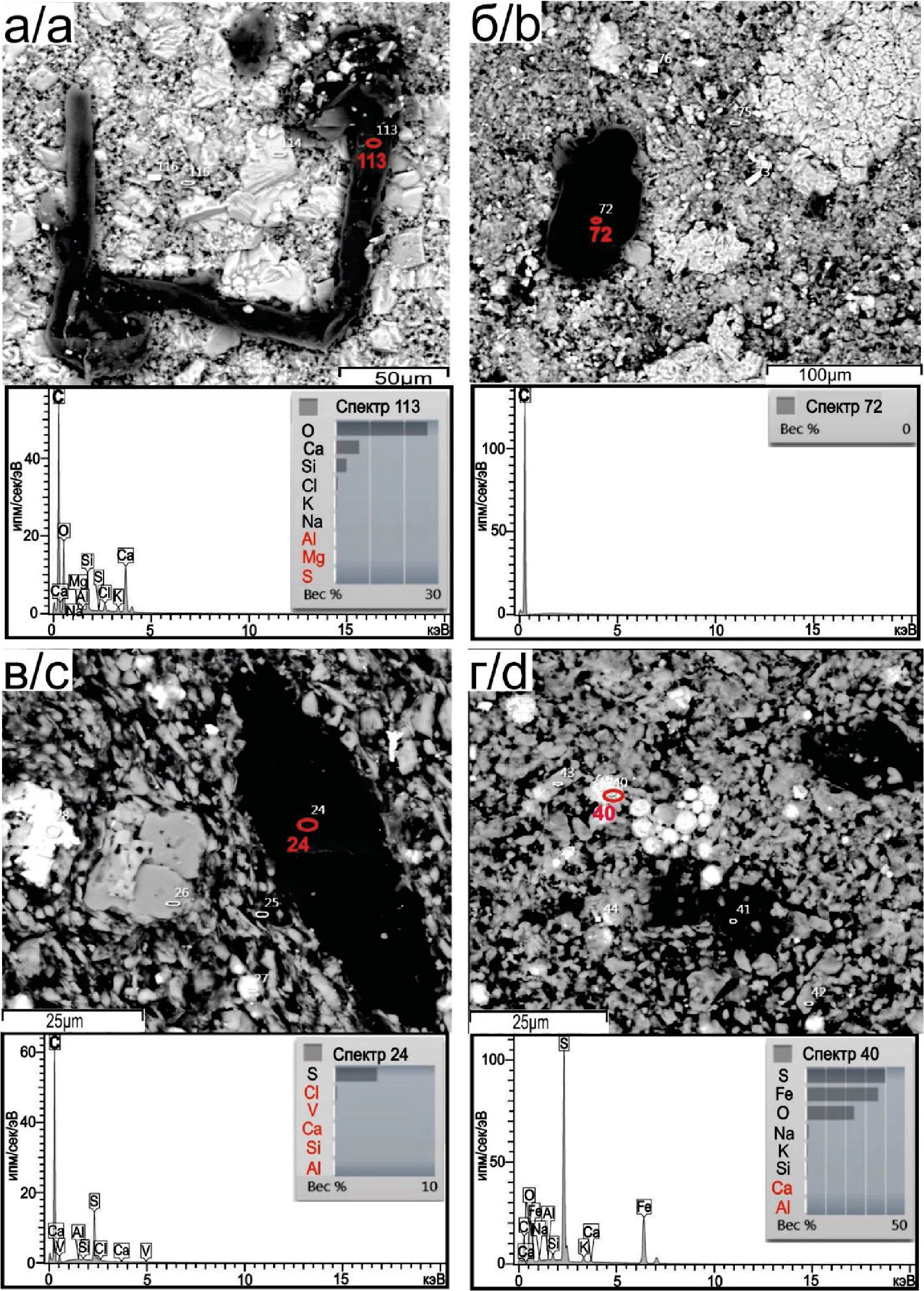 Рис. 5. Органическое вещество (снимки в ОРЭ с результатами рентгеноспектрального микроанализа): а) хорошо сохранившийся фрагмент цианобактериального планктона нитевидной формы; б) углефицированный остаток, в составе которого отсутствуют элементы-примеси; в) линзовидное выделение коллоальгенита; г) тонкоперетертый цианобактериальный детрит в ассоциации с фрамбоидальным пиритом