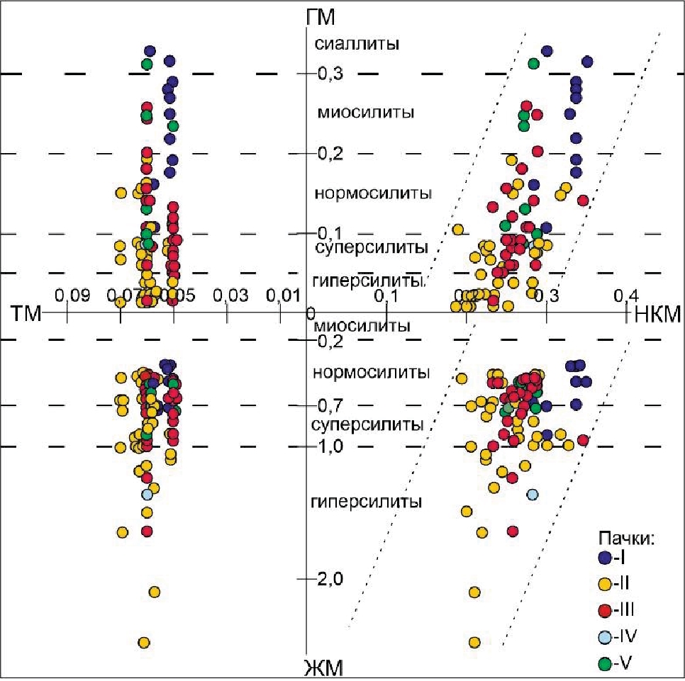 Вместе с ГМ для разделения глиноземистых и железистых компонентов применяется железный модуль – ЖМ (Fe2O3+FeO+MnO/TiO2+Al2O3). Согласно показателям ЖМ в бороулахском и маспакыйском горизонтах с более высоким содержанием глинистого и карбонатного материала доминируют нормально железистые силиты. В амыдайском горизонте наблюдается переслаивание нормо-, гипер- и супержелезистых пород, причем первые два типа присутствуют примерно в равных количествах, а объем силитов с повышенным ЖМ заметно меньше.
