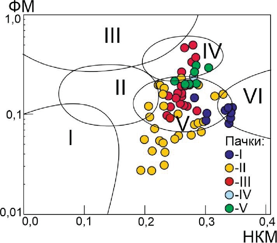 Диаграмма ФМ–НКМ (рис. 7) используется для установления состава глинистого вещества. На ней видно, что фигуративные точки составов пород в большинстве сосредоточены в полях IV и V, отвечая преобладанию глинистого вещества хлорит-иллитового состава (IV) и смешанослойных минералов (V), за исключением нескольких образцов боханского горизонта, в глинистом веществе которых помимо гидрослюды есть тонкодисперсная примесь полевых шпатов (VI). Этот вывод полностью совпадает с петрографическими наблюдениями и данными рентгеноструктурных исследований.