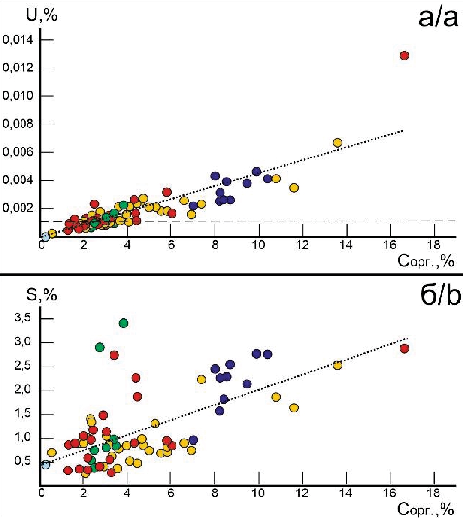 Рис. 8. Взаимосвязь содержания органического углерода и урана (а) и серы (б)