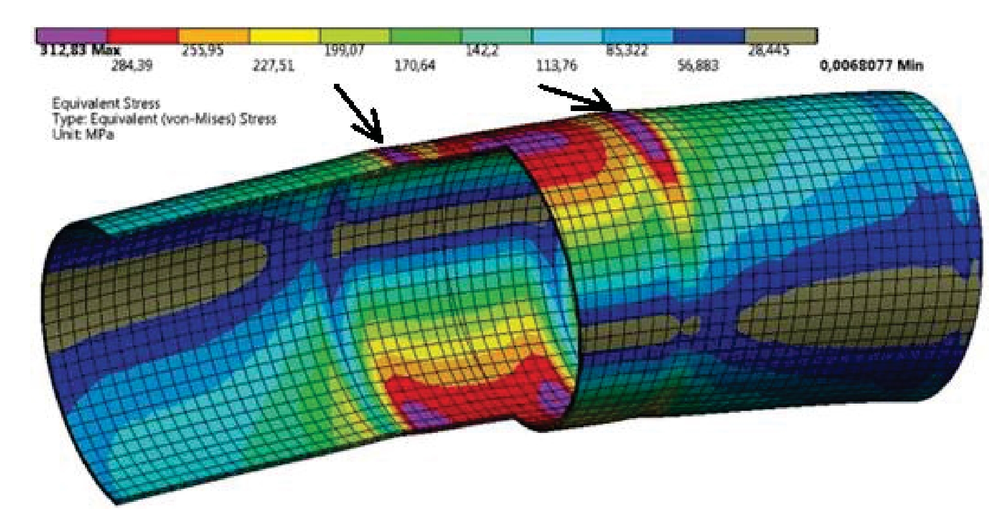 Fig. 1. Equivalent stress pattern distribution in pipeline with concrete coating with pure flexure (concrete coating is not shown) [16, 17]