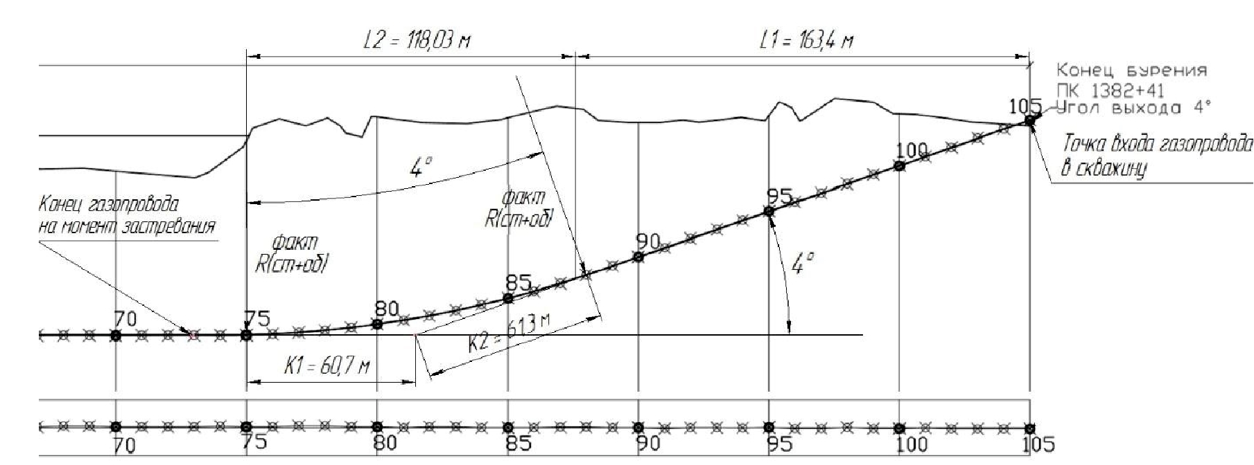 Радиус изгиба на участке «74–75» составляет 2218 м, что отвечает требованию . Большое значение радиуса изгиба пилотной скважины на данном участке объясняется тем, что высотный перепад между точками позиционирования «74» и «75» составляет всего 2 см при условии, что на прилегающем прямолинейном горизонтальном участке пилотной скважины L3 разность высотных отметок между соседними точками позиционирования в среднем составляет 1 см (участок «74–75» близок к прямолинейному).